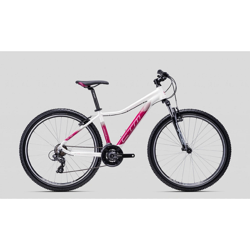 Dámské horské kolo s hliníkovým rámem s váhou 14,2 kg, odpruženou vidlicí (zdvih 80mm), průměrem kol 29", ráfkovými brzdami, páčkovým řazením s 21 rychlostmi (3x7 rychlostí).
