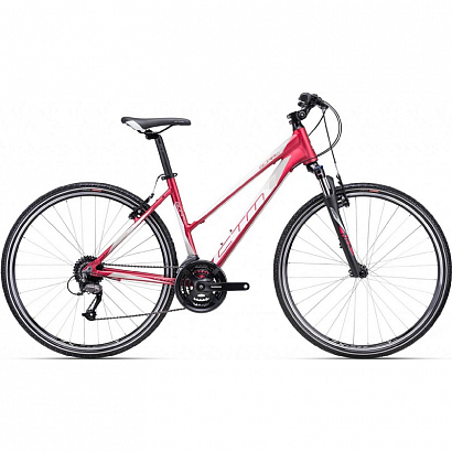 Dámské krosové kolo CTM Bora 2.0 se sníženým duralovým rámem s váhou 14,6 kg, průměrem kol 28", odpruženou vidlicí, kotoučovými brzdami, přehazovačkou, přesmykačem a páčkovým řazením Shimano Altus s 27 rychlostmi (3x9 rychlostí).
