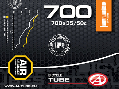 Duše AUTHOR 700x35/50C vyrobená ze 100% butylové pryže s velmi nízkou propustností pro plyny. Udrží tlak vzduchu v pneumatice jízdního kola po delší dobu, než duše vyrobené ze syntetické pryže.